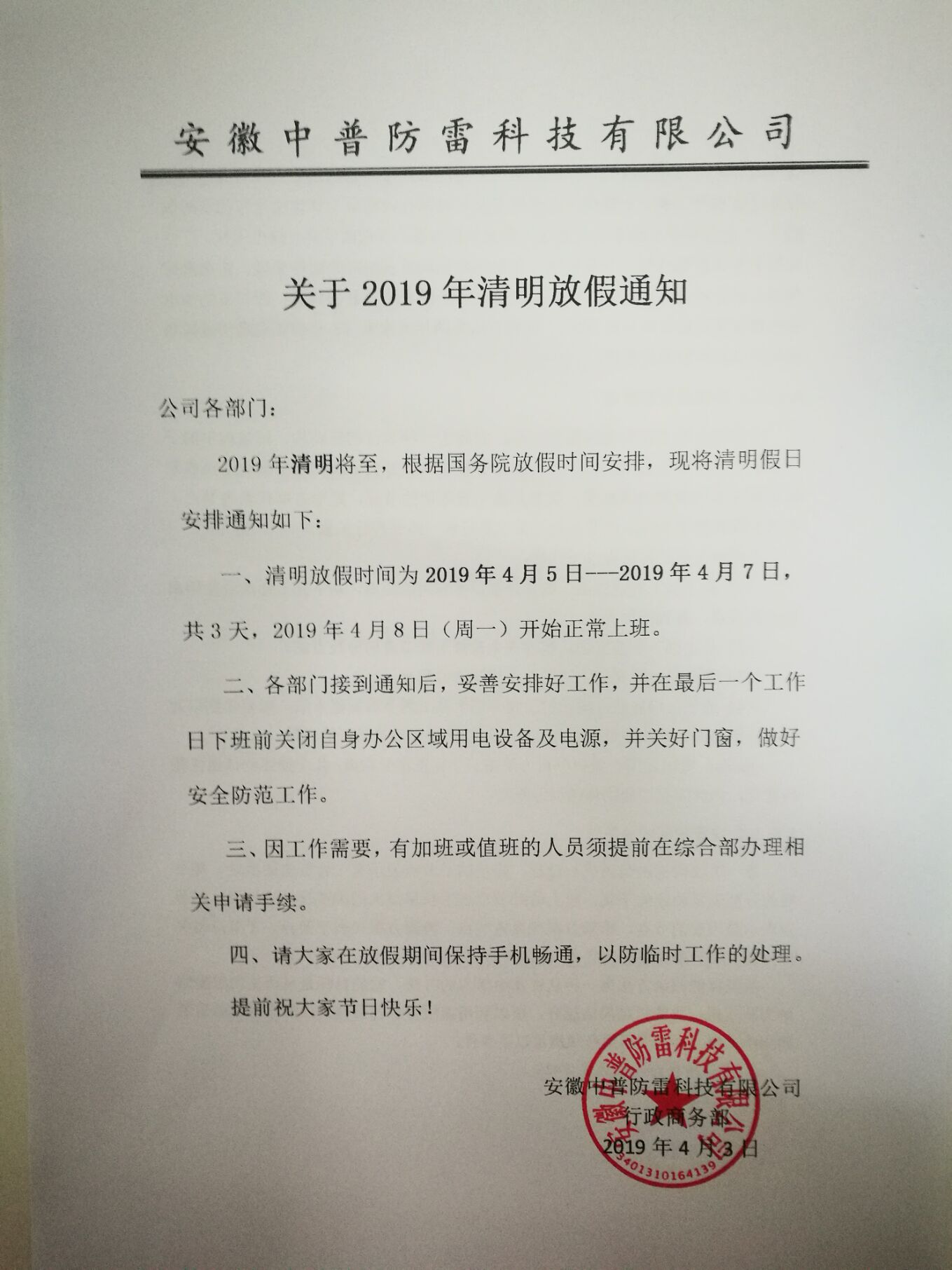 安徽中普防雷“關(guān)于2019年清明節(jié)放假通知”